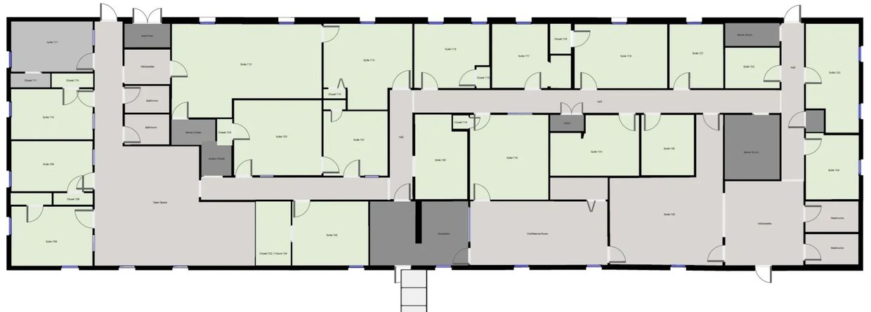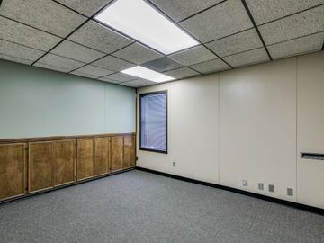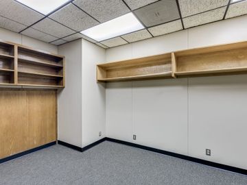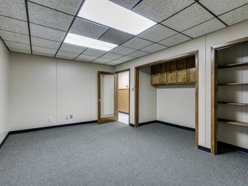 North-facing window, upper built-ins in alcove, small closet, can connect to Suite 113.